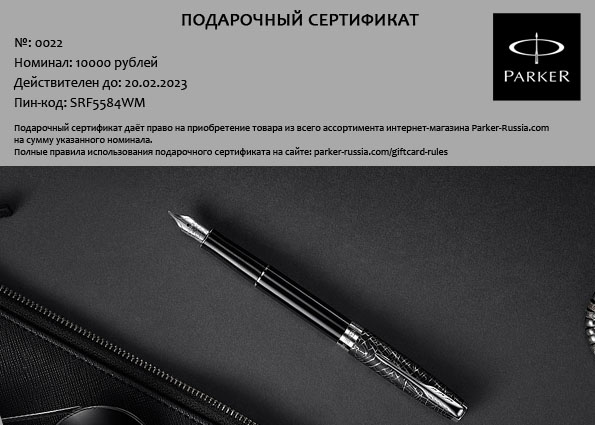 - Сертификат действует по всей нашей сети розничных магазинов и в интернет-магазине https://parker-russia.com/